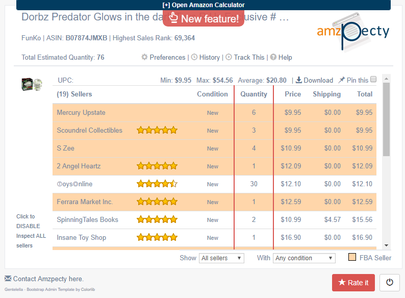 To use the calculator, just run Amzpecty search on a product and in the results page click the [+] Open Amazon Calculator.